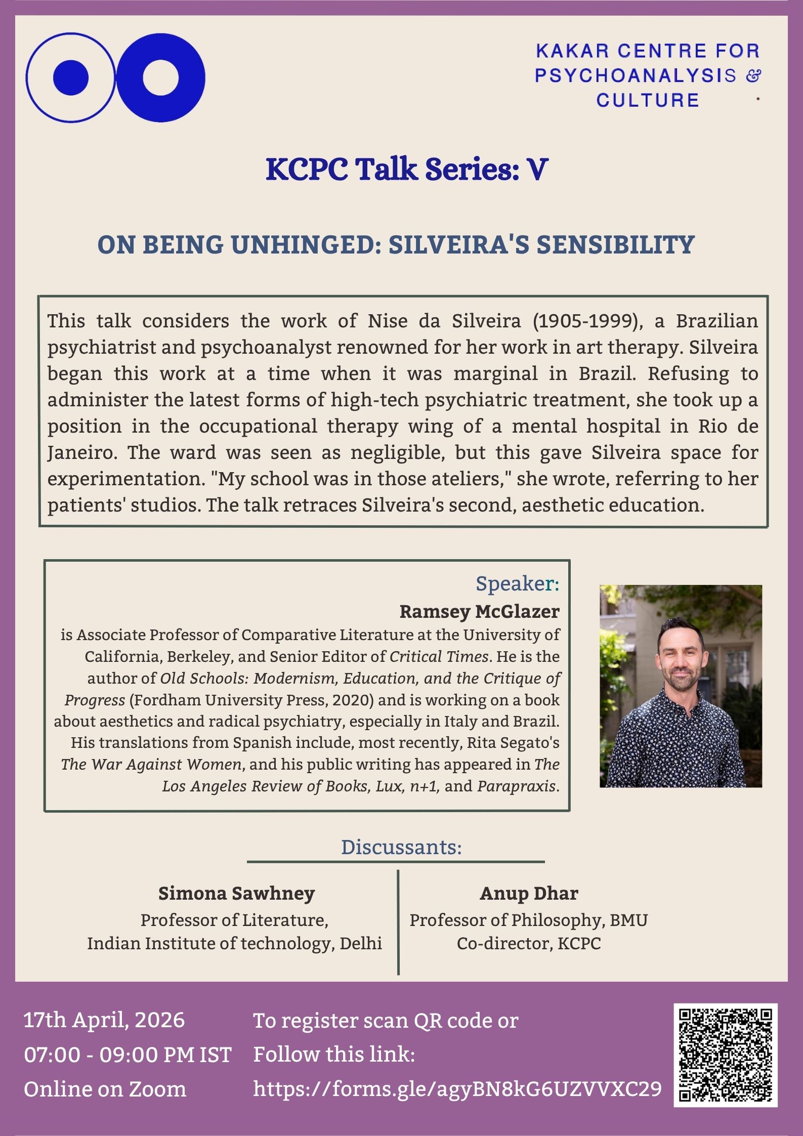 Zur online-Teilnahme am nächsten Vortrag am Freitag, 17. April 2026 (15.30 bis 17.30 Uhr deutscher Zeit), sind alle Interessierten herzlich eingeladen. Der Referent ist Prof. Dr. Ramsey McGlazer von der University of California in Berkeley. Sein Vortrag befasst sich mit dem Werk der brasilianischen Psychoanalytikerin Nise da Silveira, insbesondere mit ihrem kunsttherapeutischen Ansatz.